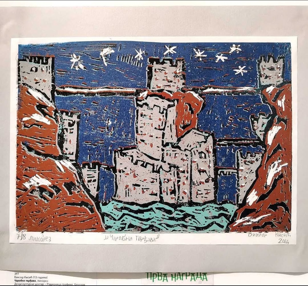Са задовољством вас обавештавамо да је ученик наше школе, полазник Радионице графике ДКЦБ, Виктор Кисић 8/2 освојио прву награду на 60. дечјем октобарском салону Музеја примењене уметности за графички лист “Чаробна тврђава” рађен техником линореза.
